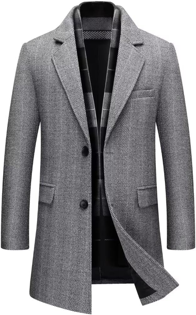 Mens Wool Blend Coat Warm Winter Trench Coat with Detachable Soft Scarf Single Breasted Overcoat