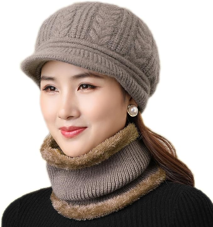 Womens Winter Beanie Hat Scarf,Fleece Lining Warm Knitted Slouchy Beanie Scarf Hats Cap with Visor